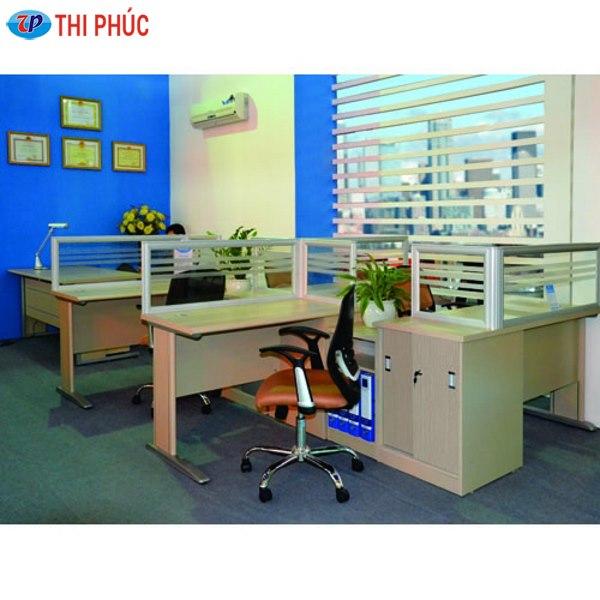 - Module bàn làm việc 4 chỗ gồm 4 bàn mặt chữ nhật xếp so le kết hợp tủ tài liệu thấp sử dụng hệ thống vách ngăn nhôm kính dành cho văn phòng.